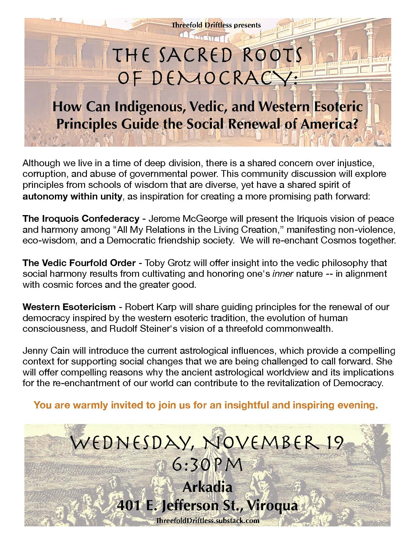 I found this to be a rich theme but with only fifteen minutes I had to leave out a great deal of what I could have said about the Sacred Roots of Democracy from the perspective of Western Esotericism and Anthroposophy. Hopefully, I will have more opportunities to write and speak on this topic soon. In the meantime, don’t hesitate to reach out with your feedback on this talk and your own reflections on this topic.